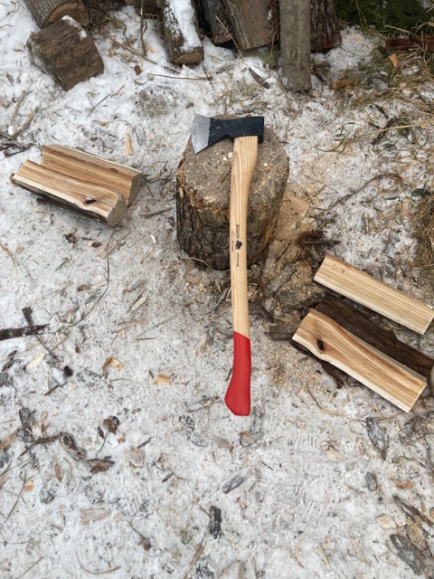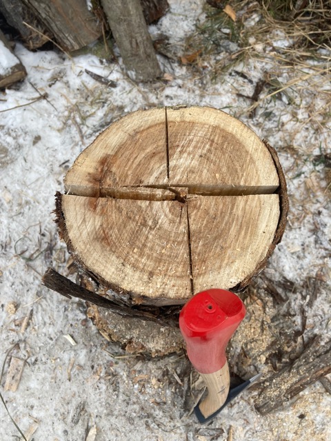 真っ二つに割った木を半分ずつ拾っては台にのせ、それぞれをまた割っていく、この作業がふと、大義に思える時がある、雪の中で割ってる時とか。