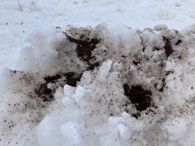 そしてある日の朝、そういえばと思って、いつもプレス式のポットで入れているコーヒーの出涸らしを雪塊の上に撒いてみた。
